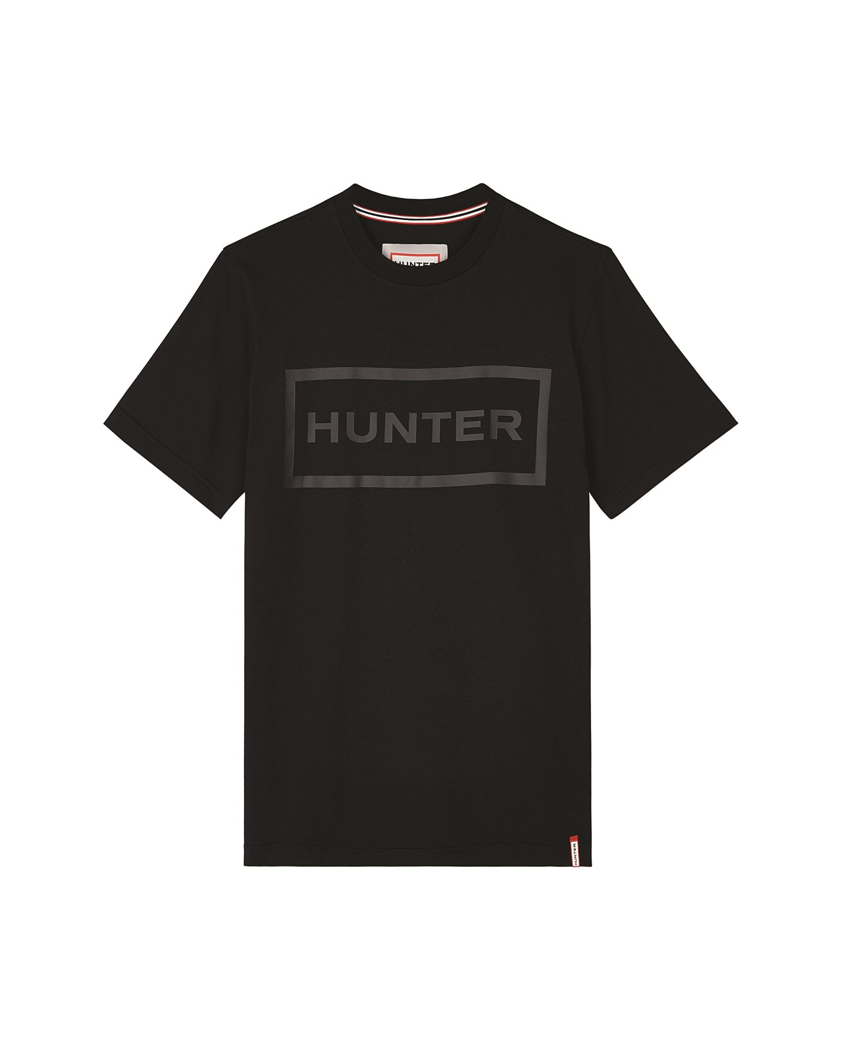 Featuring a casual crew neck and short sleeves, this lightweight black t-shirt is made from 100% cotton for a comfortable, breathable feel. Perfect for sunny getaways or as a smart base layer for chilly days, the tonal matte Hunter box logo makes for a subtle feature, while the logo tag at the hem references Hunter's signature red box logo.