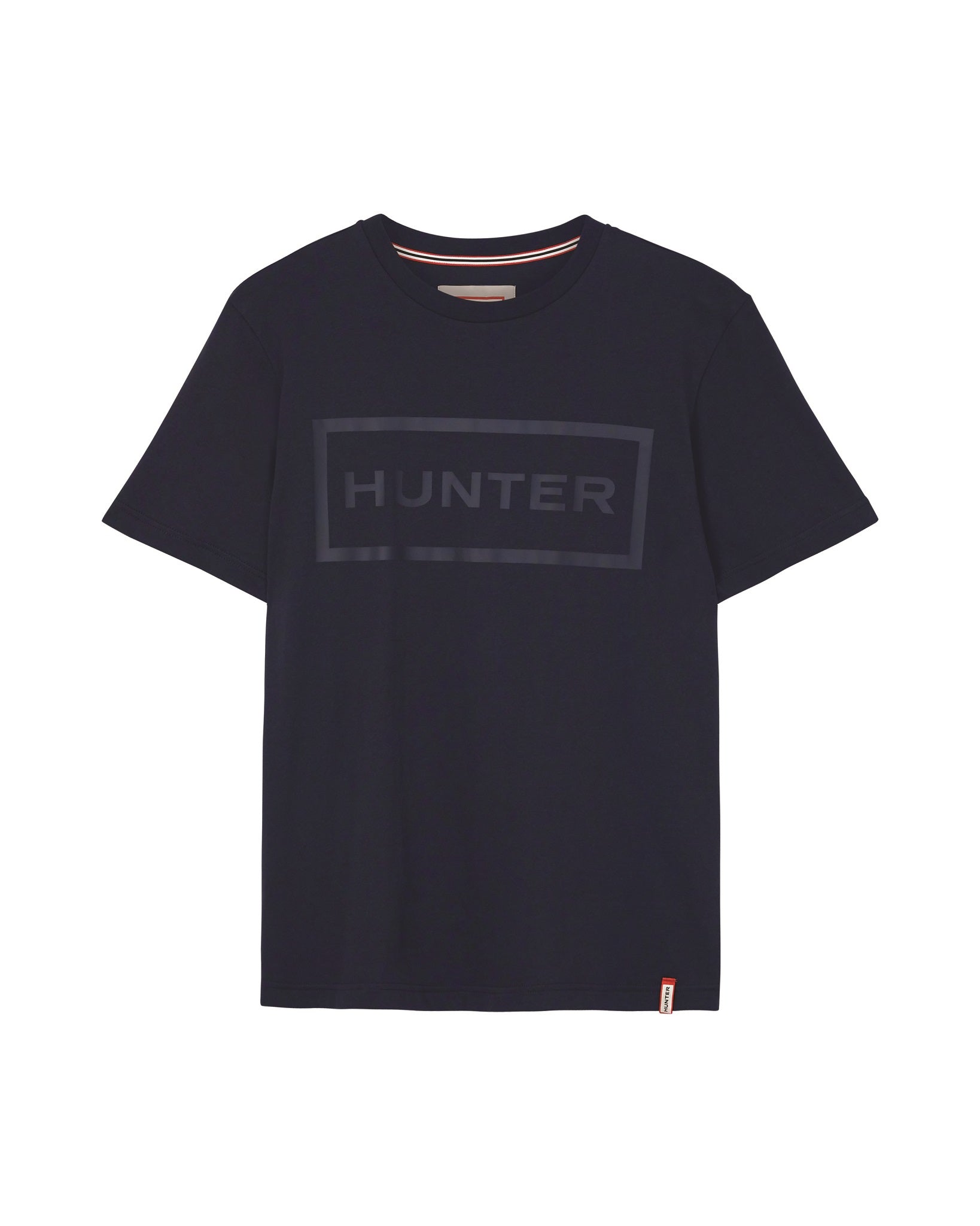 • Hunter signature red box logo tag at hem