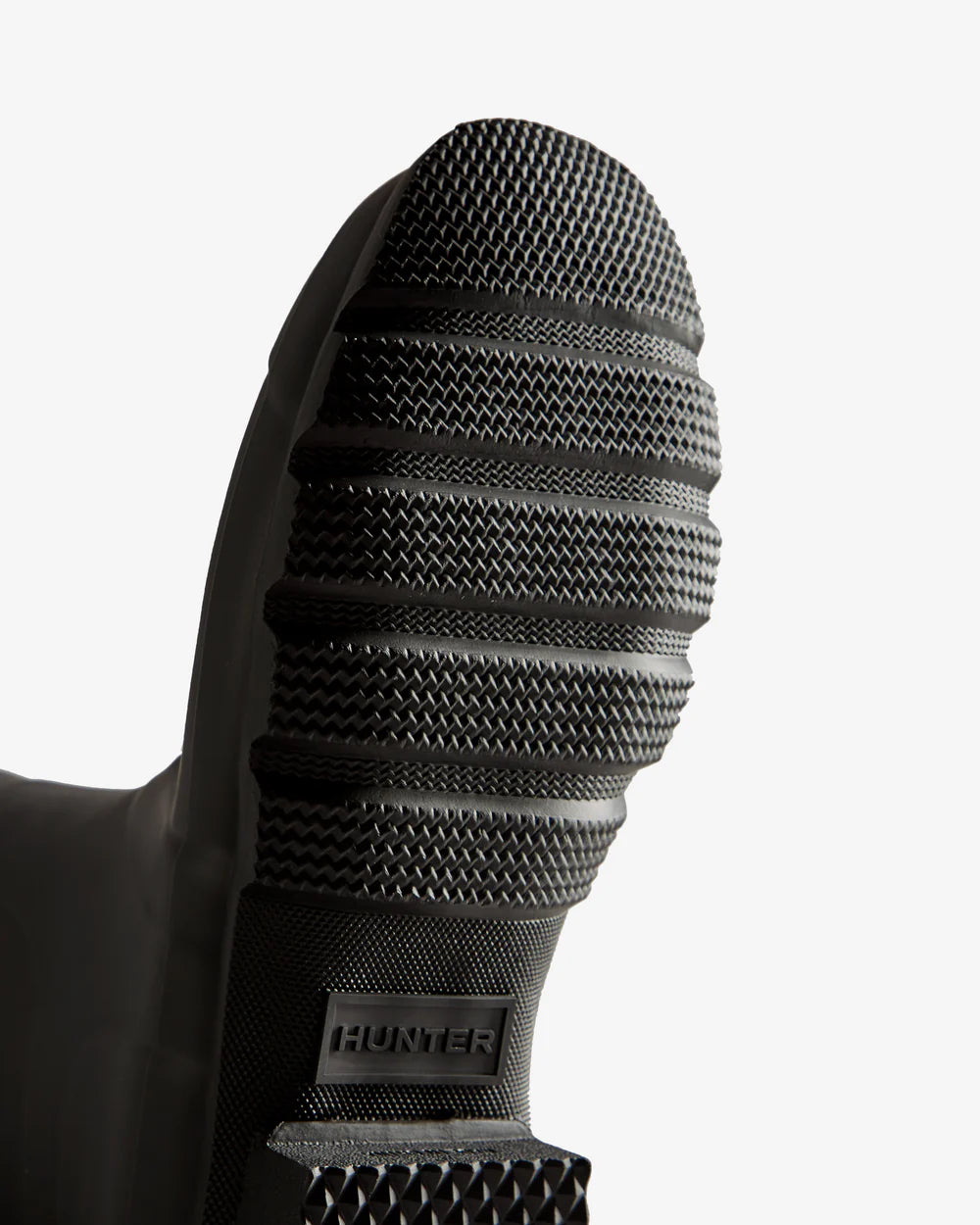 Crafted from FSC®-certified natural rubber from forests independently audited to Forest Stewardship Council® standards. The Hunter Original Short Boot has now been updated with the iconic Hunter tri-colour logo on the backstrap. Perfect for wet-weather conditions, this natural rubber rain boot is a shorter version of the iconic Hunter Original Tall Boot. Each black boot is handcrafted and assembled over three days before being vulcanised for superior protection. The Hunter Original tread pattern and comfortable recycled polyester linings complete the design.