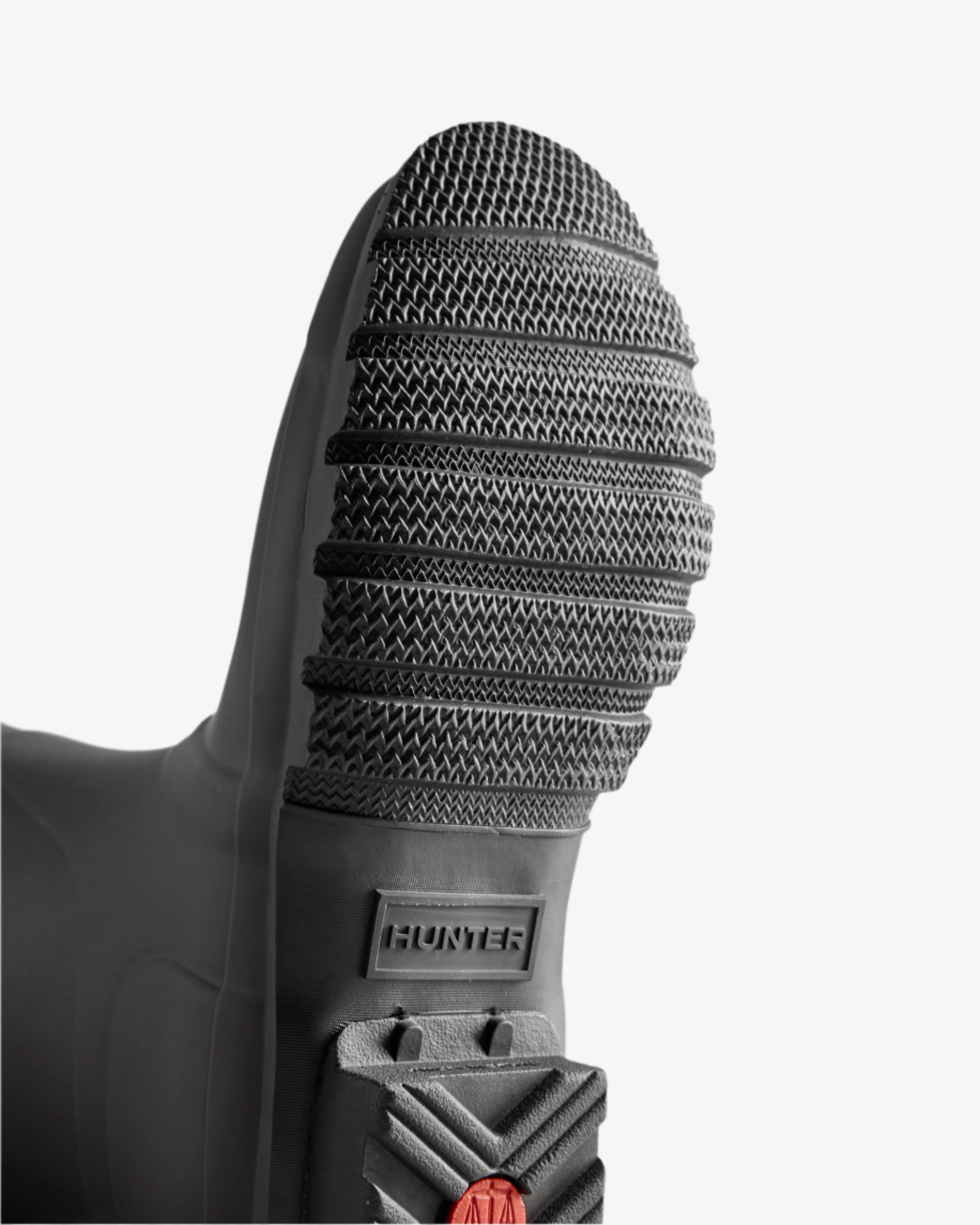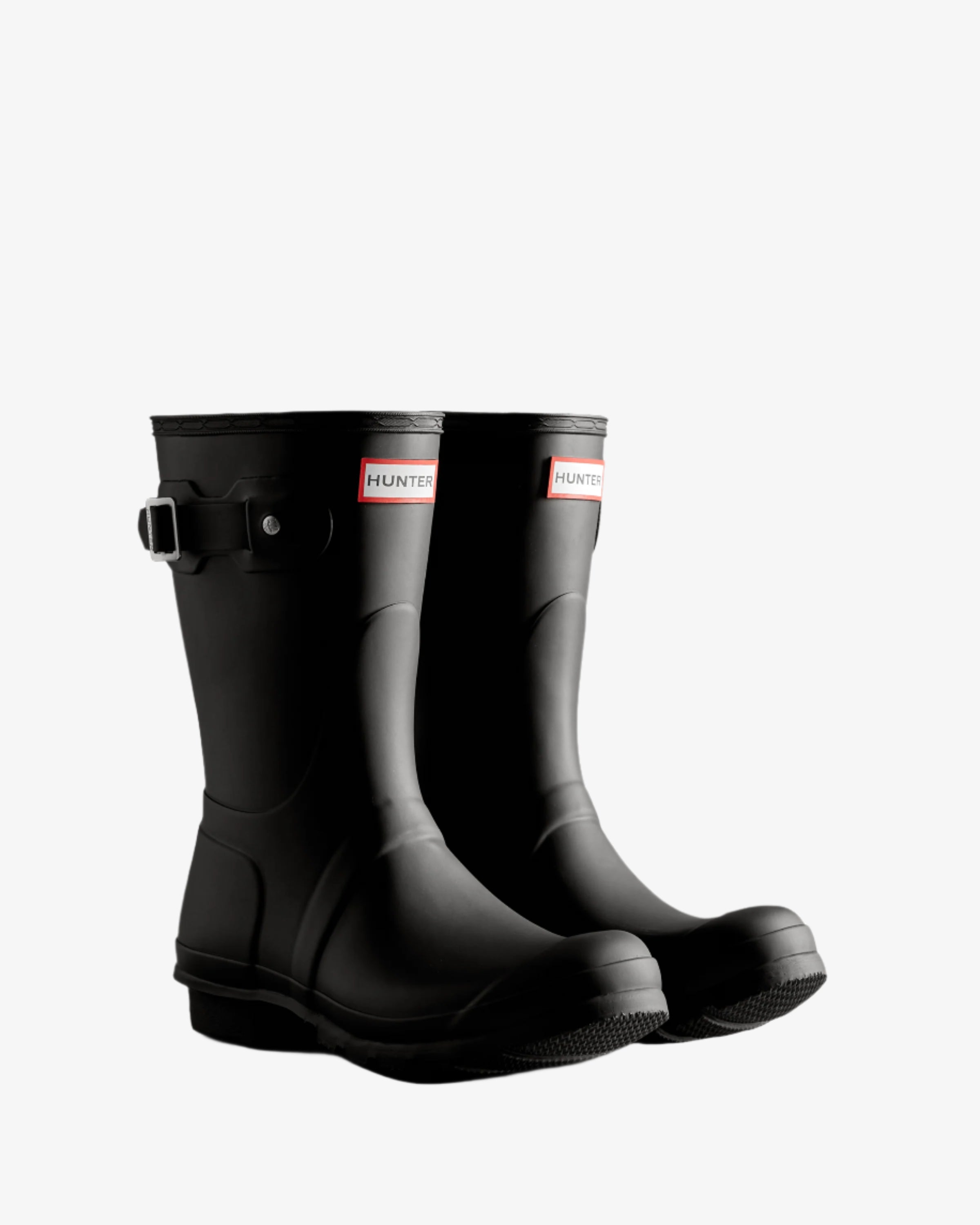 Crafted from FSC®-certified natural rubber from forests independently audited to Forest Stewardship Council® standards. The Hunter Original Short Boot has now been updated with the iconic Hunter tri-colour logo on the backstrap. Perfect for wet-weather conditions, this natural rubber rain boot is a shorter version of the iconic Hunter Original Tall Boot. Each black boot is handcrafted and assembled over three days before being vulcanised for superior protection. The Hunter Original tread pattern and comfortable recycled polyester linings complete the design.